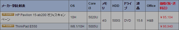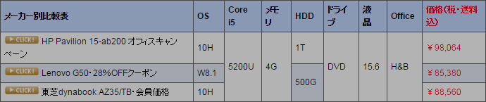 | メーカー別比較表(価格順) | OS | CPU | メモリ | SSD | 液晶 | 価格(税・送込) |