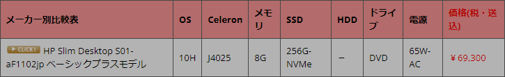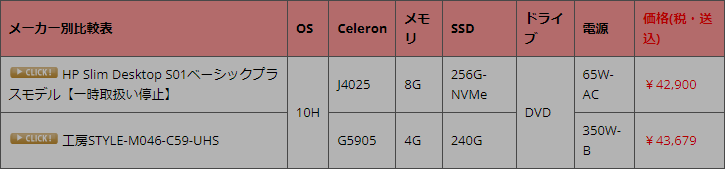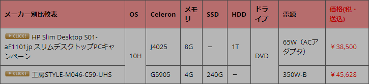 メーカー別比較表 OS Celeron メモリ SSD ドライブ 電源 価格(税・送込)