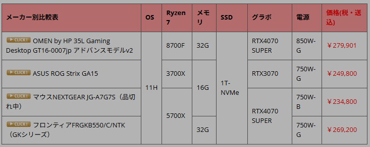 今回も最も安かったのはフロンティアとなりました。 2位に1万円近い価格差をつけていますが、さらにフロンティアはメモリが倍の32GBもあり、電源も80PLUS GOLDと高性能タイプを採用しています。 非常にコストパフォーマンスの高いモデルです。