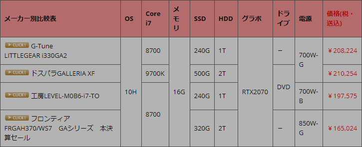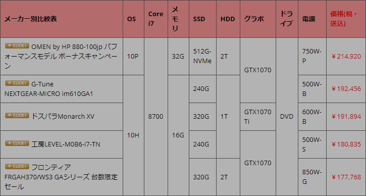 前回と比べて今回はスペックが下がっております。 HPは人気のシリーズしか表示されないので、そこから高性能にカスタマイズされる可能性もありますが、モデル名記載の他メーカーを見ても、Core i7搭載モデルはパソコン工房の一機種を残して消えてしまいました。 グラボも一つのみですし、SSD採用も半々と言ったところでしょうか。