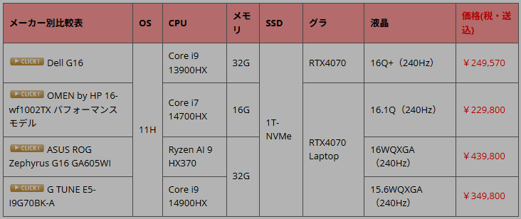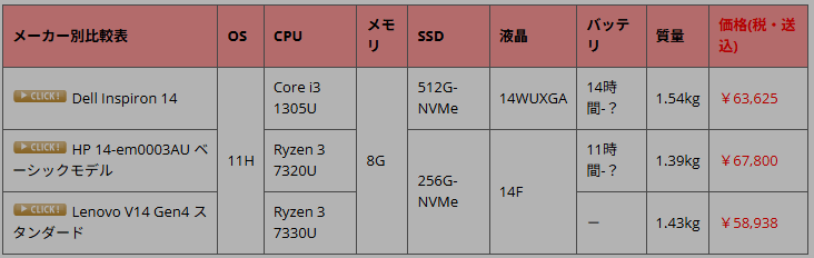 メーカー別比較表(価格順) OS CPU メモリ SSD 液晶 バッテリ 質量 価格(税・送込)