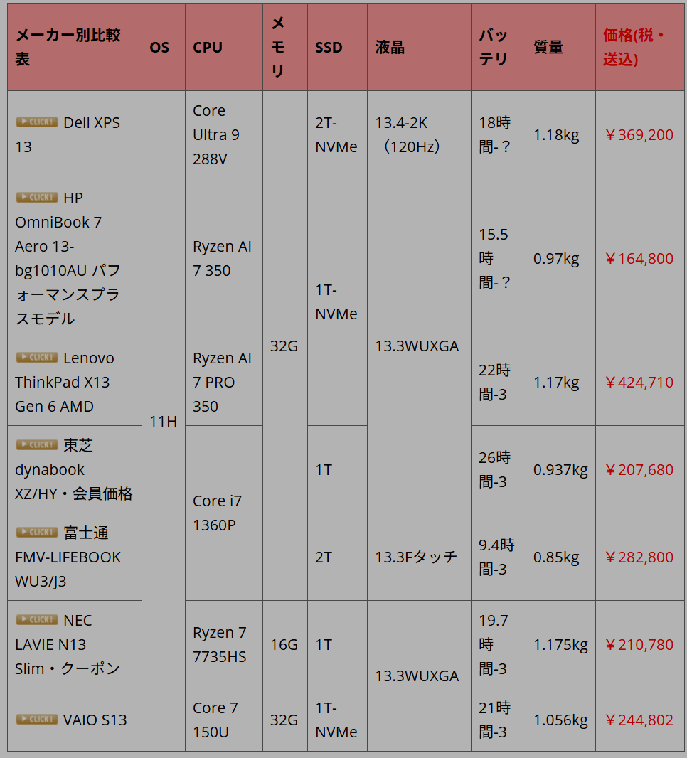 3ヶ月ぶり38度目の更新です。 今回はNECのCore i7搭載モデルが品切れのため除外し、全7メーカーとなっております。 また、モバイルなので今回からバッテリ駆動時間と質量も掲載したいと思います。