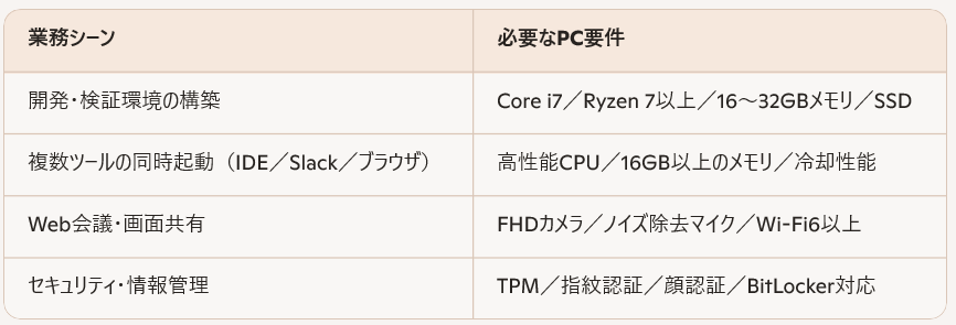 IT・通信業界のリモートワークでは、開発環境の安定性・複数ツールの同時起動・Web会議の品質・セキュリティ対策が求められます。 「スペックが高ければOK」ではなく、“用途に合った最適化”が成果に直結します。