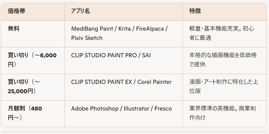 – 予算を抑えたいなら:無料ソフトでも十分に描ける。KritaやFireAlpacaは機能も豊富。