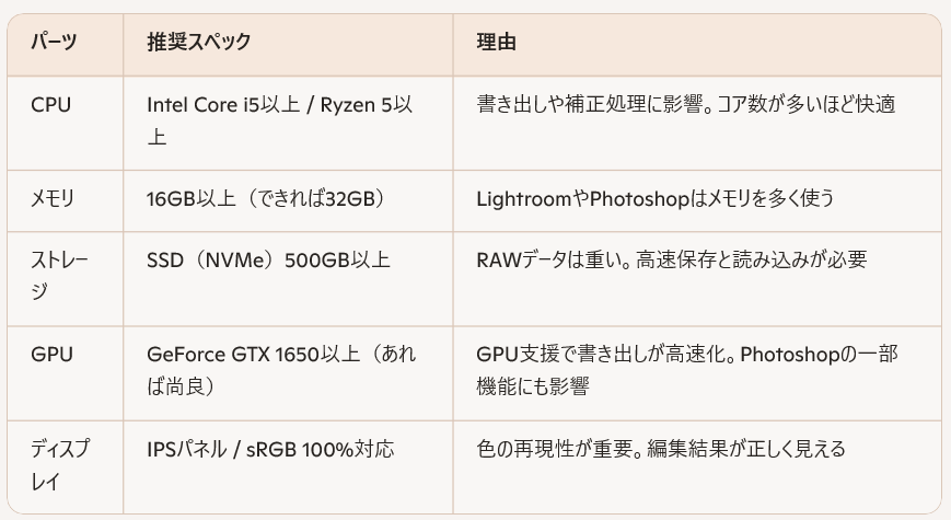 RAW現像は画像処理負荷が高いため、パソコンの性能が作業効率に直結します。 最低限のスペックとしては以下の通りです。