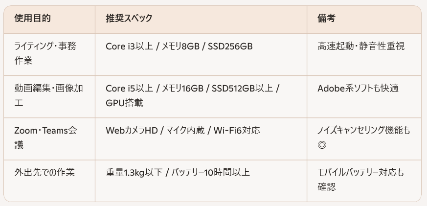 A. ライティング中心ならOK。ただしSSD搭載・メモリ8GB以上を推奨。