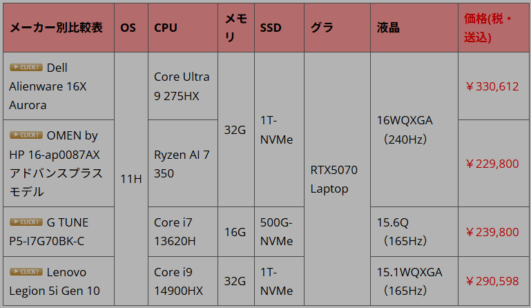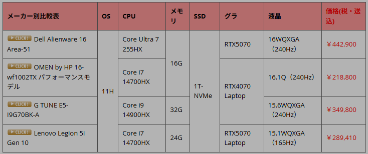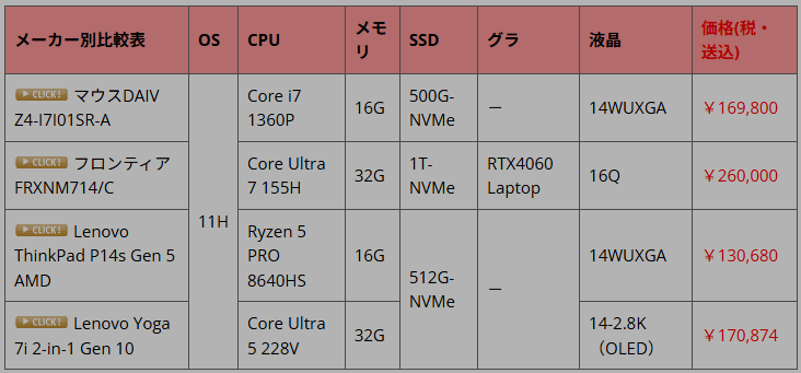 | メーカー別比較表(価格順) | OS | CPU | メモリ | SSD | グラ | 液晶 | 価格(税・送込) |