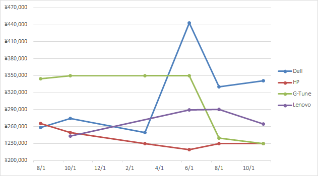 今回も最も安かったのはHPとなりました。 初登場のASUSは一番高くなってしまいましたね。 一方、価格の安いDellとHPですが、揃って値下げされています。 共に前回と同構成で、Dellは24371円ダウン、HPも2万円ダウンと大幅値下げになっています!! 2メーカーの価格差は2万円近くありますが、性能差も大きいので、どちらも検討する価値はありそうです。
