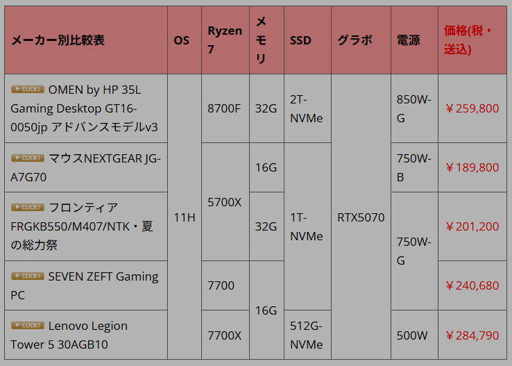 | メーカー別比較表 | OS | CPU | メモリ | SSD | グラボ | 電源 | 価格(税・送込) |