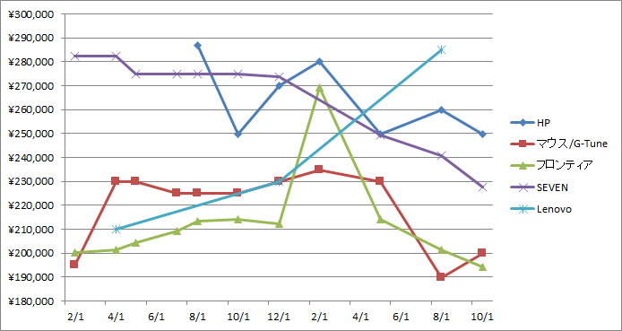 今回はわずかながら値下げされたところが多かったようです。 最安は今回もマウスコンピュータですが、こちらも値下げされていますね。 前回と同構成で5千円ダウンしていますが、この2年間での最安になります。