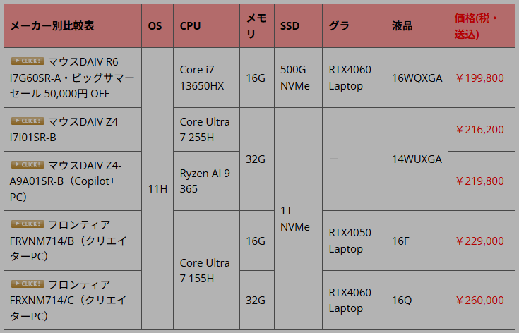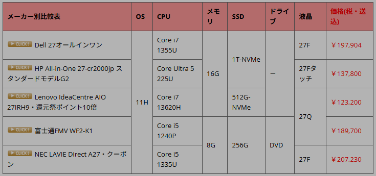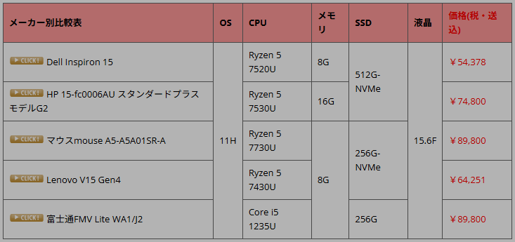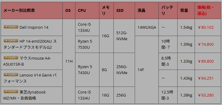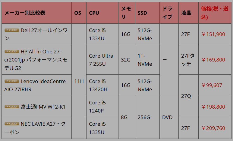 | メーカー別比較表(価格順) | OS | CPU | メモリ | SSD | ドライブ | 液晶 | 価格(税・送込) |