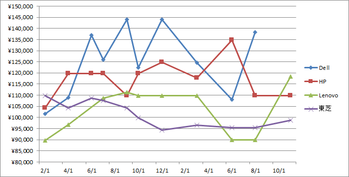 今回の注目は、大幅値下げされたLenovoです。 前回と同構成でなんと23593円も値下げされています!! これは、全メーカーの過去2年間での最安でして、しかも11万円台が最安でしたから、それより1万円もダウンしたことになります。