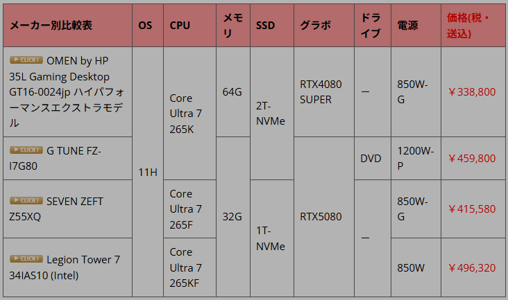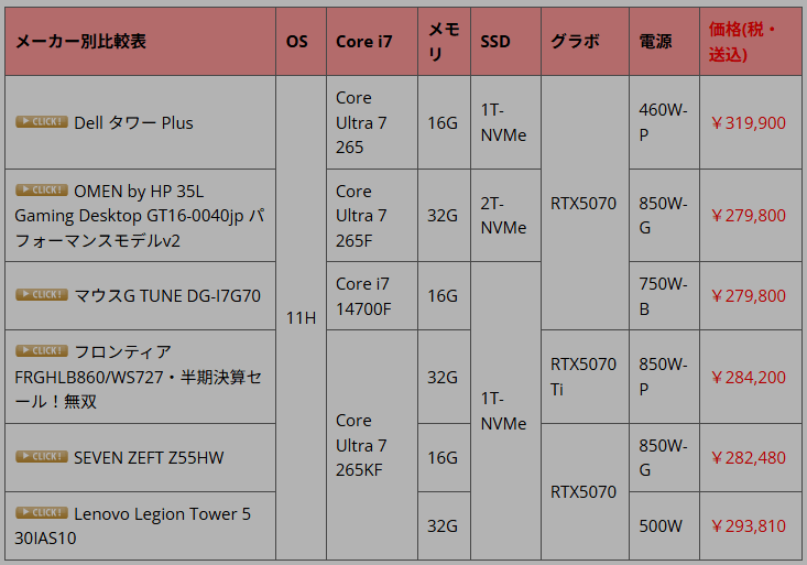 メーカー別比較表(価格順) OS CPU メモリ SSD グラボ 電源 価格(税・送込)