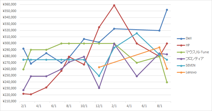 今回は残念ながら値上げされたところが目立っています。 とくにHPやLenovoと言った最安モデルが上がっているのは残念ですが、逆に、フロンティアやSEVENと言った品質の良さそうなメーカーは下がっています。