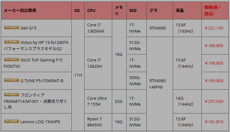 | メーカー別比較表(価格順) | OS | CPU | メモリ | SSD | 液晶 | 価格(税・送込) |