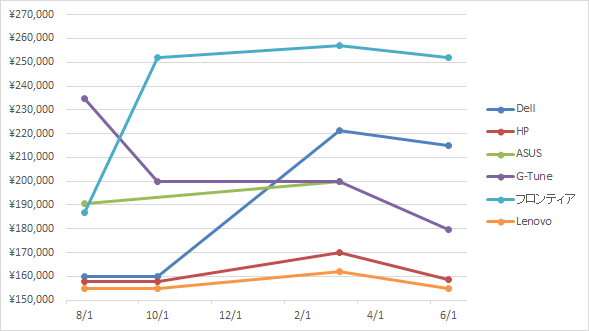 今回はとくに順位に大きな変動はありませんでしたが、LenovoがCPU変更で順位を大幅に上げております。 ただ、気になったのがDellとHP、そして東芝が構成そのままに価格が急上昇していました。 これはおそらくトランプ関税の影響かと思いますが、今回影響のなかった富士通やNECなどもいずれ上がりそうです。