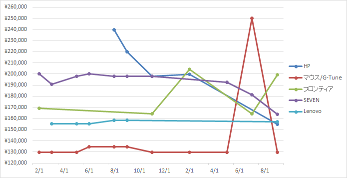 今回も最も安かったのはマウスコンピュータとなりました。 2位のLenovoを25410円も引き離していますが、SSDこそ半分なもののCPU性能はずっと良いので、総合的にコストパフォーマンスは非常に高いです。 もう、この半年間はずっと同じ価格となっています。