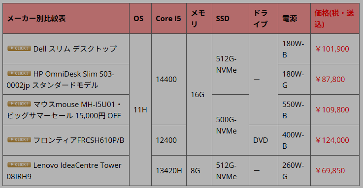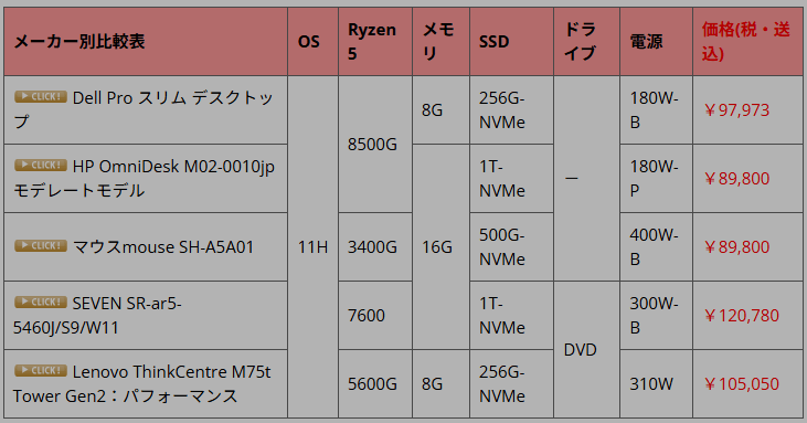 | メーカー別比較表(価格順) | OS | CPU | メモリ | SSD | 電源 | 価格(税・送込) |