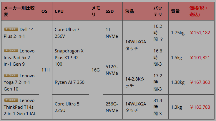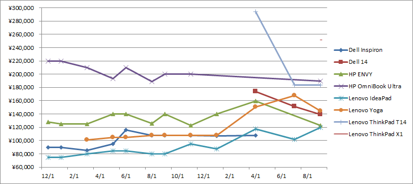 今回は値下げされたところが多かったです。 最も安いのは今回もLenovoですあ、前回、前々回の値上げを取り戻すように価格ダウンしました。 とくに最安のLenovo Yoga Slim 7iはこの1年間での最安を記録しています。